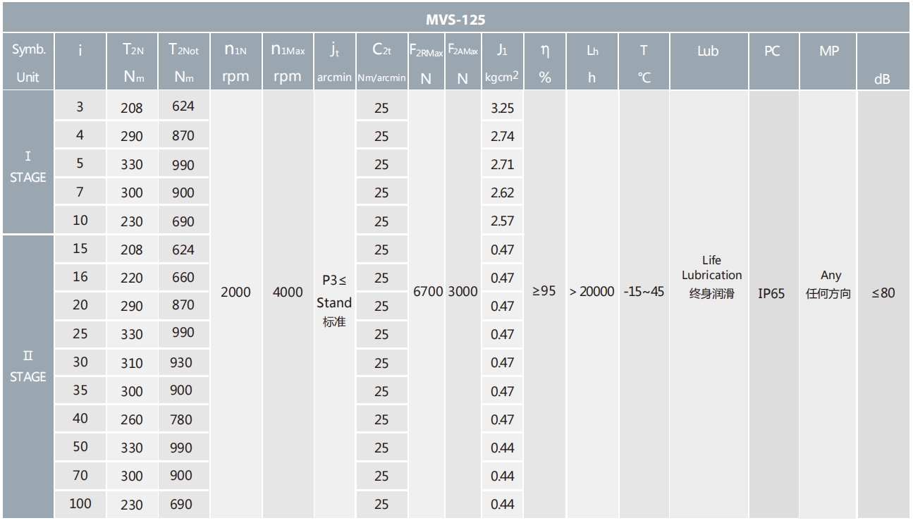 MVS-125-L2系列超精密背隙行星減速機系列(P0): MVS-125-L2系列精密背隙行星減速器系列(P1): MVS-125-L2系列標準背隙行星減速機系列(P2):