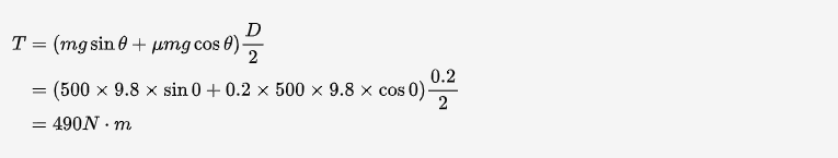 其中,m 為負載重量,g 為重力加速度,θ為斜坡角度(此處為 0 度),μ為摩擦力系數,D 為車輪直徑(假設為 0.2m)。